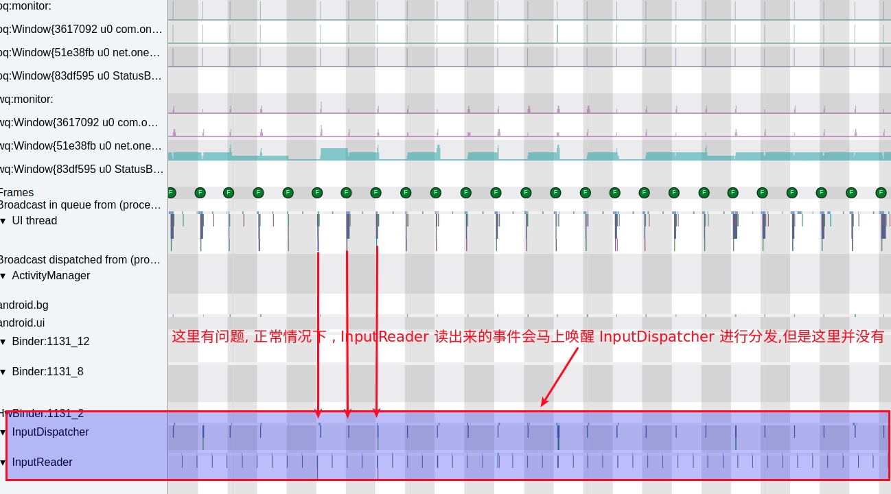 如下图 , 这是一个连续滑动的 Systrace 图 , 最下面两行是 InputReader 和 InputDispatcher , 可以看到在滑动的过程中, InputReader 和 InputDispatcher 没有读出来 Input 事件, 导致卡顿