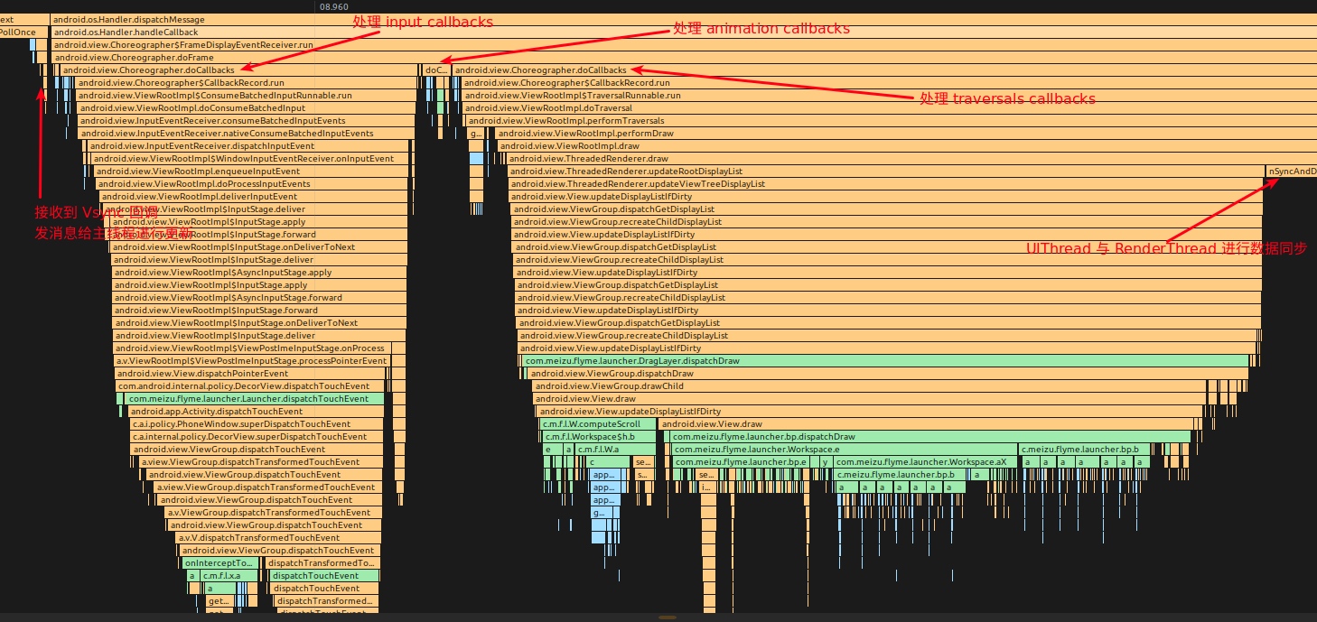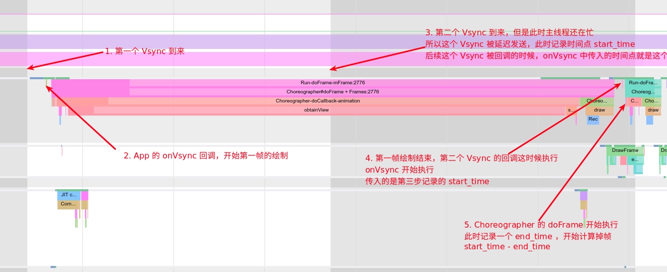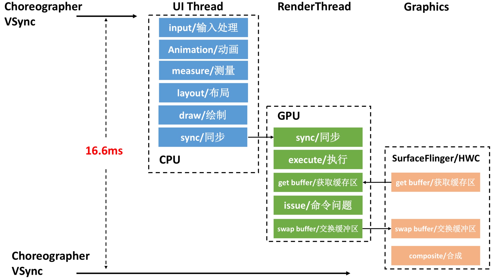 - 每一帧处理的流程:接收到 Vsync 信号回调-> UI Thread –> RenderThread –> SurfaceFlinger(图中未显示)