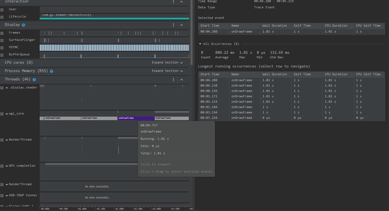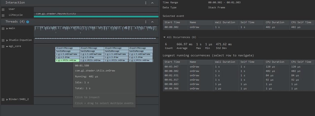通过上面 Trace 可以知道是在 egl_core 线程中的 onDrawFrame 操作耗时,如果发现不了问题,建议导出到 https://ui.perfetto.dev/ 进一步分析,可以查找源代码看看 onDrawFrame 是什么东西, 我们通过查找发现 onDrawFrame 是 Java 函数 onDrawFrame 的耗时,要分析 Java 函数耗时情况,我们要录制一个 Java Method Trace,如下: