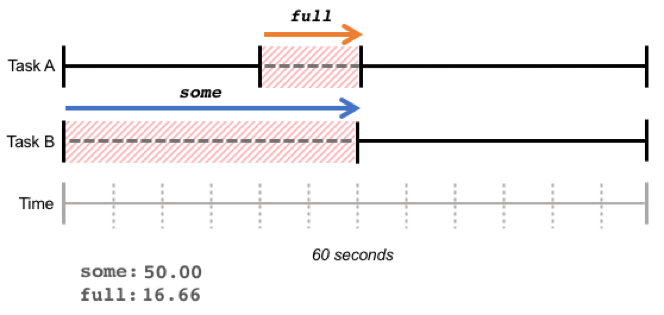 红色阴影部分表示任务由于等待 IO 资源而进入阻塞状态。Task A 和 Task B 同时阻塞的部分为 full,占比 16.66%;至少有一个任务阻塞(仅 Task B 阻塞的部分也计算入内)的部分为 some,占比 50%。